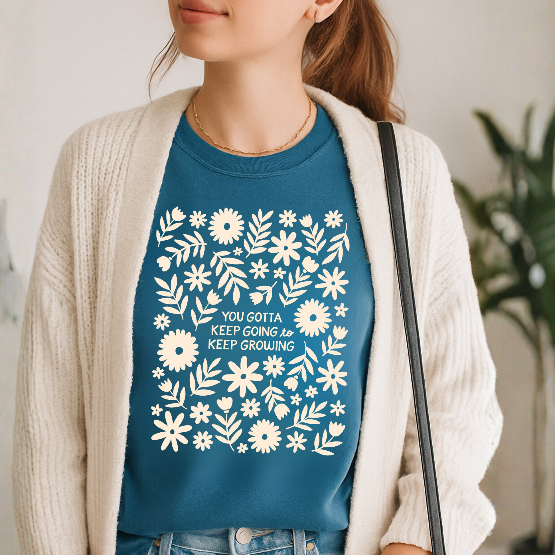 With a wonderful reminder that you have to keep going to keep growing, this worn-in stylish blue tee features hand-drawn flowers for a beautiful artistic touch. Perfect for year-round wear, pair it with your favorite denim jacket, cardigan, skirt, or leggings! Or gift, to a friend!